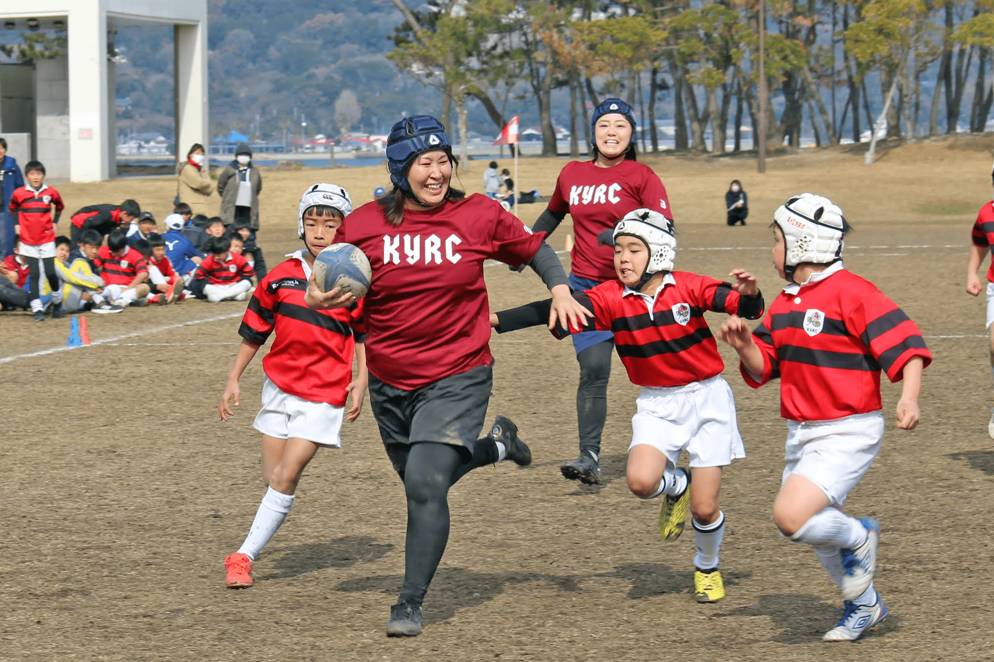マラソン大会の後は、草ヶ江の冬の名物行事、小4の子供たちとその母による母子ラグビーが行われました。
