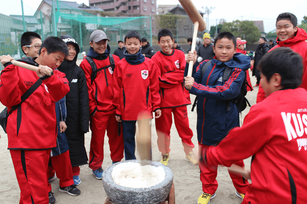 力強く杵を振り下ろす中学生たち。