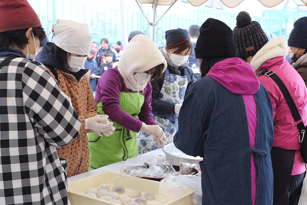 つきたての餅を手際よく丸めるお母様方。