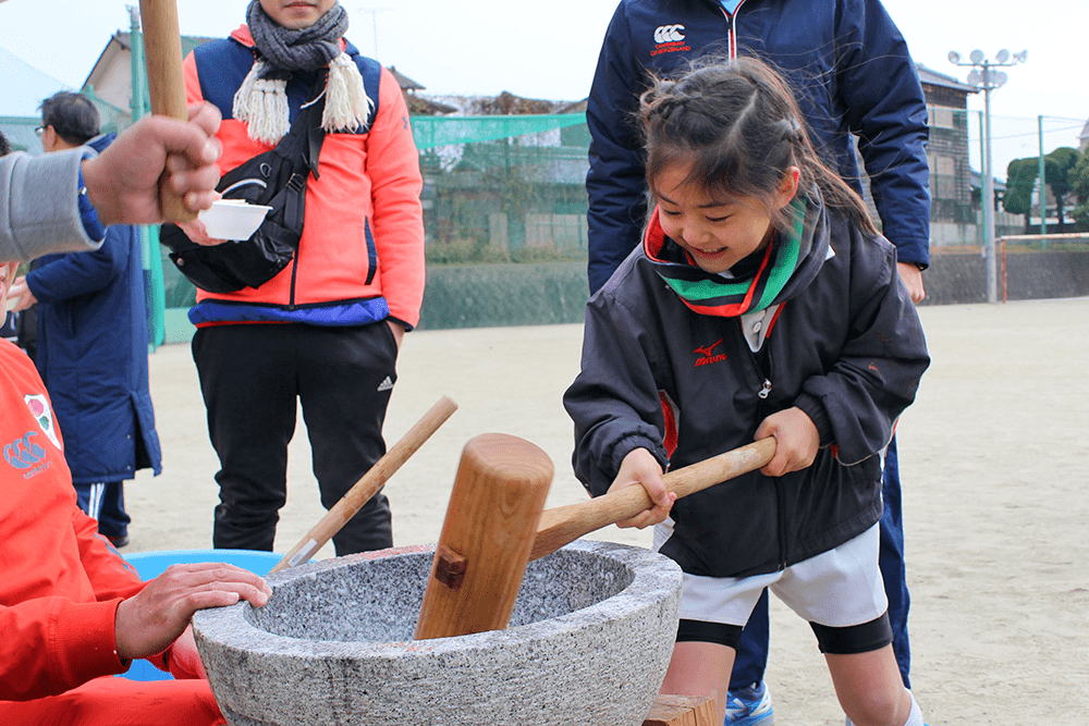 女の子も大きな杵で一生懸命お餅をつきました。