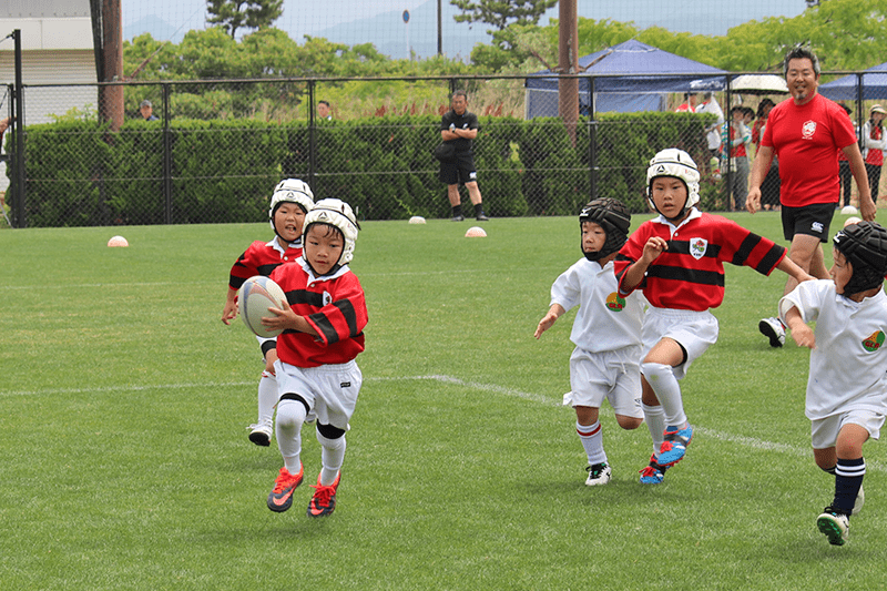 大会は「勝敗よりも子どもたちに楽しく安全なラグビーを体験させる」「大人も子どももラグビーを楽しむ」「子ども全員をゲームに出場させる」の3つの約束ごとのもと、大会趣旨どおりに子どもたちは元気いっぱいグラウンドを駆け回っていました。